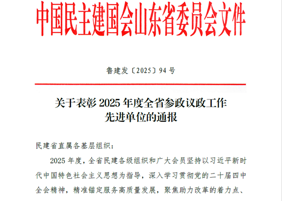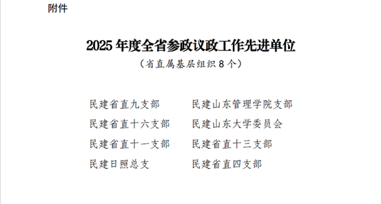 12月9日,我校民建山东管理学院支部被中国民主建国会山东省委员会授予“2025年度全省参政议政工作先进单位”。